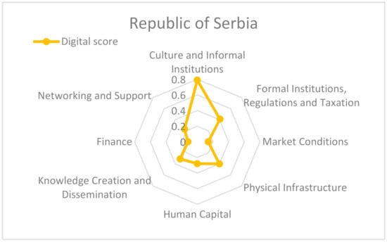 The most developed pillar of the digital entrepreneurial system of the Republic of Serbia, in its digital dimension, is Culture, informal institutions, that is, a group of indicators that affect the individual attitude towards entrepreneurship as a career choice.