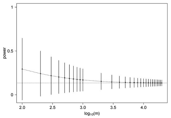 Empirical results when the p-values under the alternative hypothesis have distribution and the proportion of alternative tests is . The x-axis shows the common logarithm of the number of tests m. The y-axis shows the empirical power. The dots depict the mean of the empirical power, the vertical lines are of length one standard deviation below and above the mean. The dotted line shows the asymptotic power.