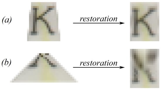 The restoration submodule resamples the source image according to the projective transform, which maps the quadrangle of the field in the source image to the rectangle of a predefined size in the document model. The resampling process is usually characterized by interpolation and antialiasing methods. Given that, under a high level of projectivity, the field image may have an arbitrary small area and consequently may not be recognizable, in this work, we focus only on the magnification problem when mapping magnifies a source region. In this particular case, anti-aliasing methods can be excluded, as after magnification, the restored image cannot contain high frequencies. The most well-known interpolation methods [35] are the nearest neighbor, bilinear, bicubic, and cubic B-spline methods. For all of the mentioned interpolation methods, except the nearest-neighbor algorithm, a small source area causes blur in the restored area, as shown in Figure 2. The images obtained by nearest-neighbor interpolation have comparatively low quality (see Figure 6), so we exclude this method from consideration.