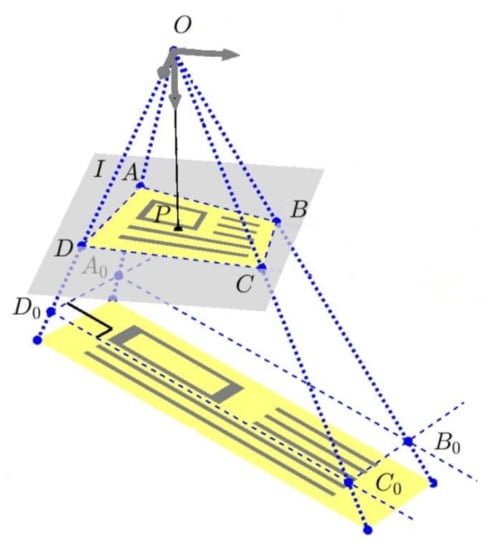 Since is assumed to be small, one can locally approximate the projective transform H with an affine transform. In this approach, it can be shown that, for a unit circle, the lengths of the ellipse semi-axes are equal to the roots of eigenvalues and of the matrix , where is the Jacobian matrix of the transform H at the point [40]. Then, for the circle with the radius , the lengths of the semi-minor and semi-major axes for the restored point , and , respectively, are calculated as follows:
