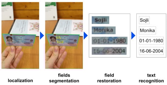 Document recognition systems commonly consist of several submodules: document localization in a source image, segmentation of required zones such as text and photo fields, and field image restoration and recognition (Figure 4). Considering the field segmentation step, the majority of the systems utilize document models. There are three general classes of models: templates, flexible forms, and end-to-end models. Templates define the strictest constraints on the location of each zone and are most commonly used for identity documents. In [25,29,30], document templates are used for the localization and classification of document images, but they are also helpful in field segmentation [31]. Flexible form models are based on text segmentation and recognition result analysis and describe documents with soft restrictions on their structure. This model may contain text feature points [32] or attributed relational graphs [33] as a structural representation of a document. End-to-end models involve the simultaneous segmentation and recognition of text field regions [34] and may not require any document structure.