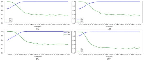 Positive and negative predictive values for varied minimum scaling coefficient thresholds estimated on the set of distorted images for fields: (a) “31.12.1981”, (b) “19.01.2013”, (c) “18.01.2028”, and (d) “12345678”.