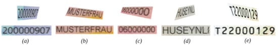 We considered template images only and scaled them to 300 dpi to obtain comparable pixel sizes for all documents. We used ground truth field rectangles to extract undistorted images of text fields with an additional 10% margin of their size. We only considered numeric fields and fields written with the Latin alphabet: dates, document numbers, machine-readable zone (MRZ) lines, document holder name, and surname. We recognized text in the obtained field images with Tesseract Open Source OCR Engine 4.1.1, which employs the LSTM neural network [41]. Incorrectly recognized fields were eliminated from further processing. In our experiments, we used 184 fields collected from all document templates. Since the text in the fields may have different fonts, font sizes, and other properties, we considered them separately in our experiments. Here, we describe synthetic data generation for one field.