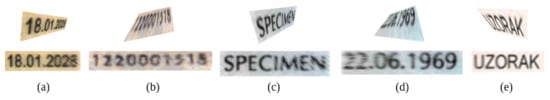 Examples of false-positive and false-negative field images for the proposed method are shown in Figure 11 and Figure 12, respectively. As we can see, for some, the recognition error is due to the OCR submodule, while the images themselves can be easily read. In the examples of false-negative images, the level of corruption differs. For example, field (b) is barely recognizable, while field (e) has adequate sharpness. The main reason is that we estimated the minimum possible sharpness in all directions. However, if the image is scaled orthogonally to the stroke, the blurring effect is small, which is seen in Figure 12e.
