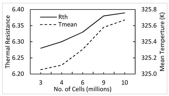 In order to save computing time and memory, the size of spatial gird size was determined by the trial-and-error method. The gird independence test was considered for thermal resistance and mean substrate temperature, as shown in Figure 2. The difference in results with grid systems 6 million, 9.1 million, and 10.44 million elements is much less than the maximum allowed limit. Thus, a grid with 9.1 million elements was selected for further calculations.