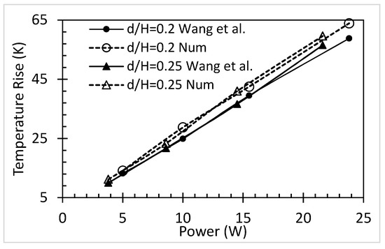 The current study’s numerical values were compared with the experimental results for a single-phase microjet silicon heat sink (k = 148 W/m K) as reported by Wang et al. [51]. The test cases with the number of nozzles 13 and 4 with a nozzle diameter of 40 μm and 50 μm were subjected to flow rates of 2 mL/min and 8 mL/min, for a power range of 3.8 to 23.8 W, respectively. A direct comparison between experimental and numerical results for maximum temperature rise in the substrate as a function of power is shown in Figure 3, with a deviation within 15%. This deviation is attributed to several factors such as simplification of the physical model and experimental uncertainties.