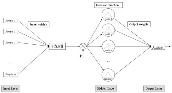 The procedure of PSO is summarized in Figure 6. The initial solution is represented by the RBNN function’s parameters, including input weights, output weights, and values of design parameters. For each iteration, the position and velocities of the particles were updated and for which the optimal solution was obtained, which is given by Equation (8).