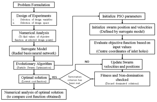 Parno et al. [24] implemented a Design and Analysis of Computer Experiments (DACE) surrogate model with PSO to optimize the solution of the groundwater problem. The sample of DACE was obtained using Latin Hypercube sampling to provide wide distributions of initial particles to yield robust convergence. Further, different variations of surrogate-assisted PSO excelled in different applications such that among Local PSO, adaptive PSO, and Global PSO; Local PSO outperformed the other two for problems with more than 10 dimensions. To improve heat transfer characteristics in a microchannel heat sink with the least trade-off of friction factor, Seo et al. [25] put forward another method wherein the objective functions were formulated by two surrogate models: Response Surface Approximation and the Kriging model. The Pareto Optimal Front obtained using a multi-objective Genetic Algorithm for two surrogate models were compared based on convergence and divergence criteria. The results of the two models were combined using K-means clustering to obtain the best Pareto Optimal front.