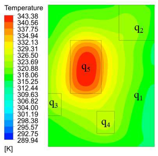 The CFD approach simulates the heat transfer and flow characteristics in the heat sink with a cooling jet with laminar flow. These results were validated with the experimental results [51]. The CFD results were used to train the surrogate model RBNN to form a continuous design space, on which the particles of PSO algorithm were allowed to search for optimum design parameters. Table 6 shows the predicted values of an optimal solution obtained by the algorithm. Using these optimal solutions, the CFD case was prepared and simulated, for which the temperature contour was plotted (Figure 7) and in which the maximum temperature was found to be 343.38 K. As shown in Table 7, for the predicted values and CFD-calculated values of thermal resistance and temperature uniformity, the percentage error was less than 2%. The metaheuristic algorithms are a powerful tool that provide the optimal solution rapidly. However, careful validation with the actual results is necessary for these algorithms since other variables influence the optimal solution, which is obtained by the trial-and-error method. Therefore, multiple solutions must be obtained prior to validation.