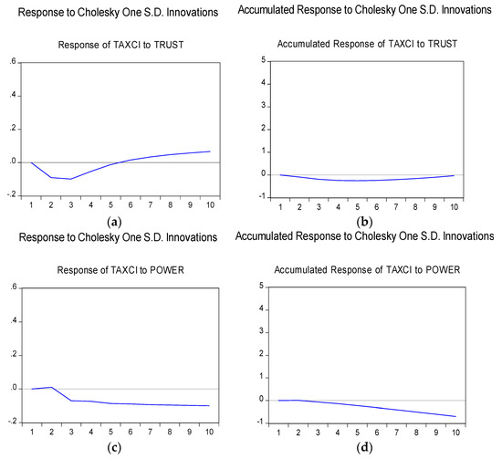 Impulse response functions of the taxci (tax compliance). (a) response of taxci to trust (public trust in politicians); (b) accumulated response of taxci to trust; (c) response of taxci to power (rule of law); (d) accumulated response of taxci to power. Source: developed by the authors.