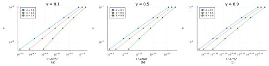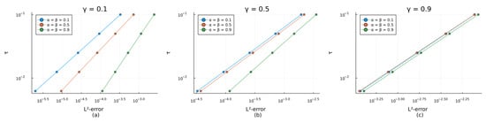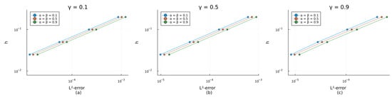 Table 2 shows that the spatial convergence order was close enough to 2.00 for all considered values of the fractional derivative orders, and therefore this result agreed well with Theorem 3. One can notice that the spatial convergence order decreased slightly as any of or approached 1. This can be explained by the influence of the error with respect to the time step due to an insufficiently small value of , = 1/20,000, and the fact that the temporal convergence order was around 1 in this case.