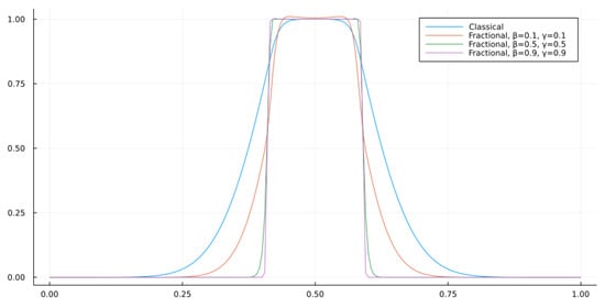 Let us recall that the motion law (6) is suitable for describing the process of fluid flow in fractured porous media with the uniformly distributed fractures over the volume []. Figure 4 shows a deceleration of the process of fluid flow, and it can be clearly seen that an increase in the orders of the fractional derivative led to a greater deceleration. This behavior confirmed the fact that the porous medium had a retarding effect on the flow process, and the orders of the fractional derivatives determined the degree of memory impact on patterns of the flow.