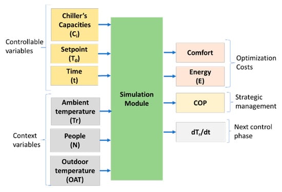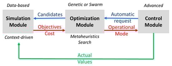 Each experiment carried out in this study executes one control cycle (petition) and addresses the optimization, without delving into the control stage. Inspired by the ACODAT management architecture for HVAC systems [], an autonomous cycle updates the model offline, maintaining its accuracy in real operational conditions, as shown by the green arrow in Figure 5.