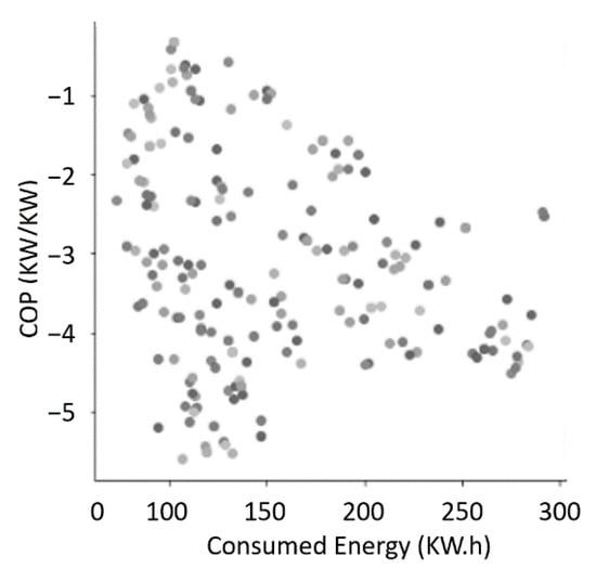 Aguilar et al. [] proposed a new flexible architecture for Building Management Systems (BMSs), with an Autonomic Cycle of Data Analysis Tasks (ACODAT) that makes use of banks of optimization algorithms for HVAC system control and hinted at its use for supervisory and self-optimization tasks. In fact, in a later study, they developed a Fault Detect and Diagnosis (FDD) system optimized with MOPSO, also capable of long-term equipment degradation, using the COP [].