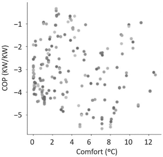The right column shows the theoretical energy savings in each case with the optimized HOMs compared with what was actually recorded in the dataset. This column also stresses the achievements in comfort with expected deviations of less than 0.5 °C and HVAC subsystems working with COPs above 3.00, which is considered a good value. These impressive results of 60–80% in energy savings, preserving the comfort and the system performance, must be adjusted with further research considering real restrictions, but they hint toward a promising line of research.