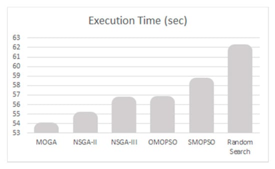 Several authors have proposed comparisons between NSGA-II and MOPSO, which may contribute to the comprehension of the results. Keshavarz et al. [] compared NSGA-II and MOPSO for the stochastic optimization of an inventory control system, showing that NSGA-II has better performance in spacing and in the number of Pareto optimal solutions, while MOPSO better spreads the fitness of the solution set and consumes fewer computational resources. Niyomubyeyi et al. [] studied optimization in evacuation planning, obtaining better convergence and spread with MOPSO, but the algorithm execution took five times longer than NSGA-II. Saldanha et al. [] obtained similar results in convergence and spread for MOPSO and NSGA-II, although MOPSO yielded better results in spacing. Elgammal et al. [] studied the integration of hybrid wind photovoltaic and fuel cells, obtaining similar system operating costs with both, but in this case, the MOPSO execution time was shorter than NSGA-II.
