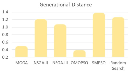 The “no free lunch” theorem is applicable for assessing the optimization [], as the improvements on one feature reduce the effectiveness on another. The algorithm performance is a balance between the achievement of solutions with values close to the PF and the runtime resources required. This proves the algorithms empirically. Riquelme et al. [] identified up to 54 metrics to prove (1) the cardinality or the number of solutions in the approximation set; (2) the accuracy, convergence, or distance to the PF; and (3) the diversity, which measures the distribution of the fitness values and how they spread. Another classification of metrics is given by the generic definition of Zitzler et al. [], being unary if only one approximation set is received and binary if two are received. This analysis takes the top three metrics in the ranking and the one that records the runtime []: