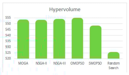 - Hypervolume (HV), S metric, or Lebesgue measure: a unary metric that obtains the total space covered by the found solutions or approximation set using a reference point []. It considers accuracy, cardinality, and diversity.