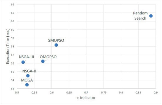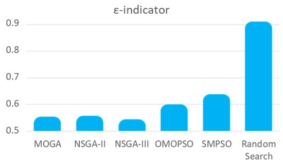 In both metrics, it is possible to identify the significant improvements of all the algorithms compared with Random Search. The ε-Indicator show NSGA-III and MOGA as the best algorithms, outperforming Random Search by 42% and 40%, while the SI algorithms were worse (31–35%). The HV does not show significant differences among algorithms but shows an improvement of 5% on average.