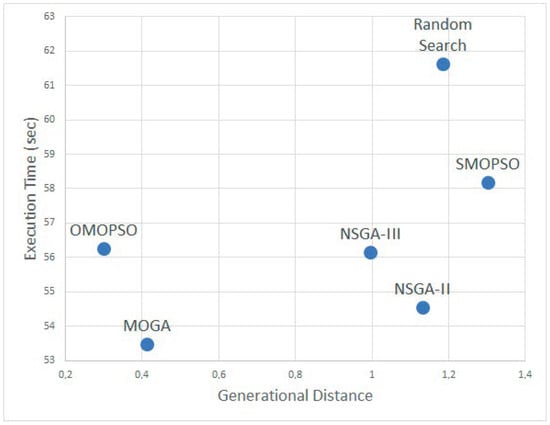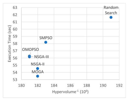 This case yields the selection of either MOGA or OMOPSO algorithms as the best for optimization accuracy. Both metrics penalize SMPSO, which obtains a GD even worse than RS. Figure 15 prioritizes the HV (the inverse in this case for obtaining a homogeneous visualization) with the ET.