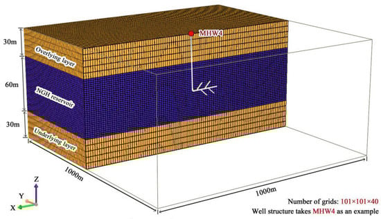 To minimize the influence of boundary conditions, the model is expanded to 1000 m in X and Y directions; the total thickness in Z direction is 90 m, of which the total thickness of the NGH reservoir is 60 m; the thickness of overburden layer is 30 m; the thickness of the underlying layer is 30 m. The grids of the overlying layer and the underlying layer are argillaceous sediments (permeability less than 15 mD) and sandy sediments (permeability greater than 15 mD), with a size of 10 m × 10 m × 6 m. The grid size of the NGH reservoir is 10 m × 10 m × 2 m, and the specific reservoir parameters and other stratigraphic parameters are shown in Table 1. A total of 408,040 grids (101 grids along the x, y-coordinate, and 40 grids along the z-coordinate) is used for the numerical simulations in this study.