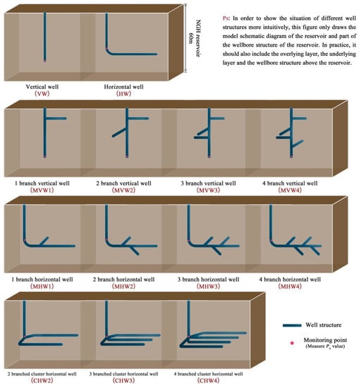 Since the 1980s, the emergence of guided drilling technology and branch completion technology led to revolutionary progress in complex structure wells, with increasing application scale and broad application areas. The complex structure well refers to all wells with a more complex structure or process except conventional straight wells, including horizontal, radial horizontal, lateral drilling horizontal, large displacement and many other drilling wells, which are expected to enhance the production capacity further and gradually realize industrial exploitation if it can be applied to offshore NGH exploitation. Currently, horizontal wells or complex structured wells with horizontal wells as the primary feature are considered the advanced technology for the efficient development of NGH. The corresponding drilling and exploitation engineering technology are highly challenging, but significant progress has been made in related research []. The wellbore established in this paper is mainly composed of four groups (Figure 3). In this case, (i) The control fitting group consists of a vertical well and a horizontal well, the vertical well is consistent with the parameters of the first decompression exploitation in the Nankai Trough and is used to verify the accuracy of the model. The horizontal well main length (L) = 100 m and both serve as reference objects. (ii) The main borehole length (L) = 38 m of the multi-branch vertical well set is composed of 1 to 4 branch wells, which are located at 5 equal points of the main well end, and their length is L = 30 m, and the angle with the main well section and other adjacent branches are 90°. (iii) The length of the main borehole of the multi-branch horizontal well group is L = 100 m, which is composed of 1 to 4 branch wells, and the branch wells are located at 5 equal divisions at the end of the main well. Their length is L = 51.3 m, and the angle between them and the main shaft section is 45°. (iv) The cluster horizontal well group consists of 2 to 4 horizontal wells with length (L) = 100 m and spacing (d) = 100 m, all at a uniform height. The above wellbore structures are all located in the central area of the geological model, and the radius rb of the wellbore is all set to 0.1 m, and the exploitation pressure is set to 4.5 MPa.