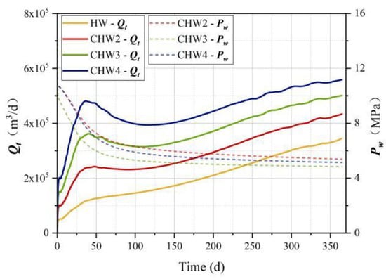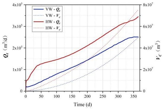Figure 5 shows, for 1 year, the gas production characteristic curves of VW and HW. The Qt of HW was greater than that of VW [], and the cumulative gas production (Vc) in the first 6 days was about 2.4 times that of VW, and the increase in production was about 1.5 times from the Vc in one year. It confirms that the horizontal well increases the contact area between the wellbore and the NGH reservoir compared with the vertical well, which expands the NGH decomposition front and multiplies the amount of NGH involved in the decomposition at the same time []. Further research by Feng et al. found that under the condition that the contact surface of horizontal wells and vertical wells are close to the reservoir, the recovery rate of the reservoir temperature in the later stage of horizontal well production is greater than that of vertical wells []. Admittedly, horizontal wells are more conducive to NGH exploitation than vertical wells, but relying solely on pressure reduction methods combined with HW is not sufficient for commercial exploitation.