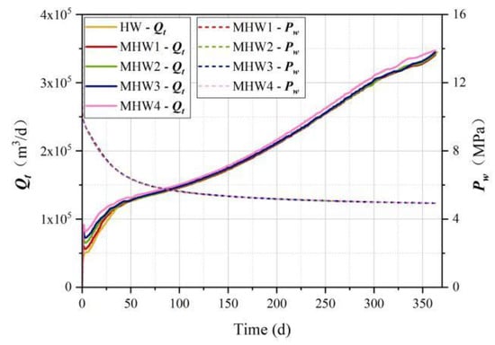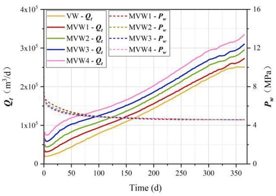 The production increase effect of MHW is not as significant as MVW (Figure 7). The diagonal branch well arrangements used in this paper are all in one plane and have short spacing, resulting in a similar trend in the mid- to late-stage curves for MHW1-3, except for a higher Qt lift compared with HW at the beginning of exploitation (first 30 days), and almost coincides with the Pw curves as well. However, when the number of diagonal branch wells reaches four, the Qt of MHW4 is more significantly improved than HW, and the combined production increase is about 5%. The following factors may cause the poor yield increase: (i) The contact area added by the horizontal main shaft is already large enough. In field projects or simulation tests, the horizontal main shaft length of MHW is usually over 100 m, while the vertical main shaft of MVW is generally in several tens of meters. (ii) Branch wells are typically operated in lengths of several tens of meters, and unlike vertical main wells, their increased contact area has little effect compared with horizontal main wells and produces a high degree of overlap in the range of pressure reduction. Therefore, it is essential to choose a reasonable layout plan for complex structural wells while weighing the cost and the effect of increasing production, because a single-minded increase in the depressurization amplitude or contact area may be counterproductive.
