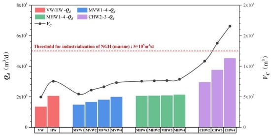 The daily production rate of 5 × 105 m3/d adopted by many scholars, is taken as the threshold value, and the average daily gas production value (Qd) of this numerical simulation are compared with this threshold value (Figure 9). The technical threshold and operating cost of VW are low, and it is the main well structure for NGH test production. However, VW has a low single well capacity, averaging tens to hundreds of thousands of cubic meters of gas per day and a small gas production range. Moreover, the life span of VW is expected to be short, with the longest-lasting only 60 days from the completed marine exploitation cases. HW can substantially increase the contact area with NGH, and the longer the length of HW, the larger the decomposition surface, which has a greater increase in productivity. In addition, compared with a single well, MVW, MHW and CHW can all increase certain productivity, of which CHW3 is only 10% away from the threshold. Overall, the present simulation results verify that the well type has significant control over the hydrate exploitation capacity. When the pressure drop is the same, the more hydrates that are decomposed when the NGH is produced under a pressure drop in complex structure wells, the better the gas production and the longer the gas production time. In particular, CHW can significantly improve production efficiency, and if a more substantial step-down can be achieved, it is very likely to break the threshold [,].