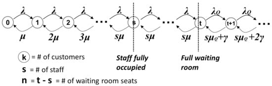 We consider two systems: reneging system and balking system. For the reneging system, we assume exponential reneging with rate . For the balking system, we assume that the arrival rate drops by a linear balking rate for each additional customer in queue. For either system, we allow changes in arrival and service rates when there is a queue that incurs abandonment, and denote these rates as and , respectively. (Thus, constant balking is incorporated in both (exponential) reneging and (linear) balking systems.) Let reneging/balking start at state , where s is the number of staff. The birth and death coefficients of the Markov chain representing the deferred abandonment model are as follows: