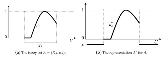 The following representation of partial fuzzy sets taken from [6] provides a transfer of a fuzzy sets’ membership function that is a partial function to L to a total function that evaluates to the extended scale . This technical trick allows the unification of fuzzy sets with various domains to a common universe U without loss of information on their domains.