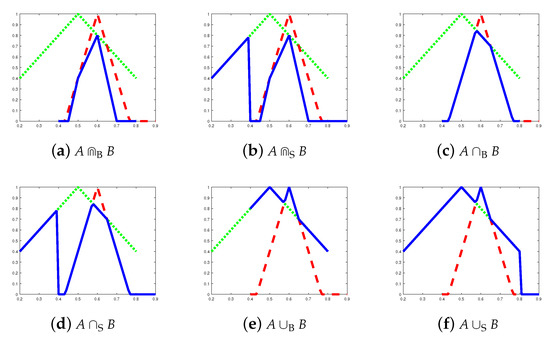 The membership degree (and other Sobociński set operations) is defined only if . Examples of Bochvar and Sobociński partial fuzzy set operations are visualized in Figure 3. The results of operations are depicted by the solid line.