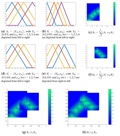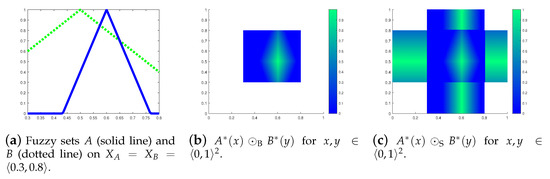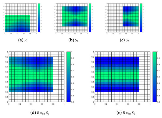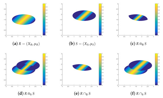 Figure 9c–f demonstrate the Bochvar and Sobociński intersections of functional partial fuzzy relations R and S. The Bochvar strong intersection is a functional w.r.t. , because . Notice that the Bochvar strong intersections are not functional w.r.t. , because (20) is not necessarily valid for all elements of . The Bochvar intersections is a functional w.r.t. , because .