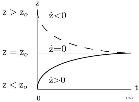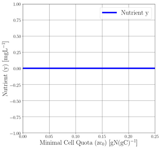 As can be seen, both eigenvalues have nonpositive real parts and there is at least one eigenvalue with a zero real part. Therefore, it is not sufficient to determine the stability of the point on the basis of the eigenvalues Df and Df. Instead, it was necessary to examine the model equations as follows. First, it is important to demarcate the physical meaning of the found equilibria. In the case of the equilibrium point , from a physical sense, the existence of biomass in the microalgae growth system when the external nutrient uptake is entirely consumed means ; thus, the intracellular quota z reaches a minimal cell quota , as shown in Figure 1.