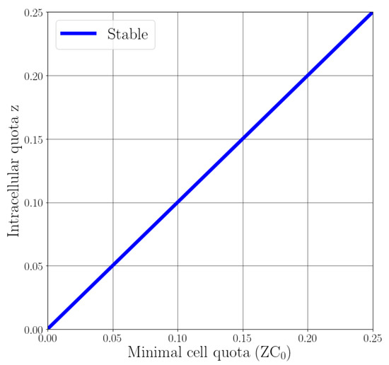 The diagram in Figure 2 shows that the stable steady state is stable for parameter values and unstable for values. As can be observed, for practical applications, it does not have significance. The sets collide and exchange stability at . The stability of depends on the value of the minimal cell quota parameter at a given initial condition. According to the above description, is stable.