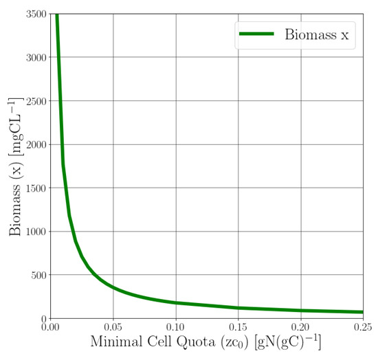 A bifurcation diagram of the biomass (x) vs. minimal cell quota (). The horizontal axis of this figure indicates the values of th minimal cell quota , and the vertical axis shows the values of biomass x. For each value of , the diagram shows the corresponding equilibrium points. Parameters: mgN, , , and was varied from 0.01 to 0.25. Initial conditions correspond to mgC, , mgN. Parameter data were obtained from [48]. We performed the simulation and plotting in Octave 5.1.0.0 and Python 3.7.1.