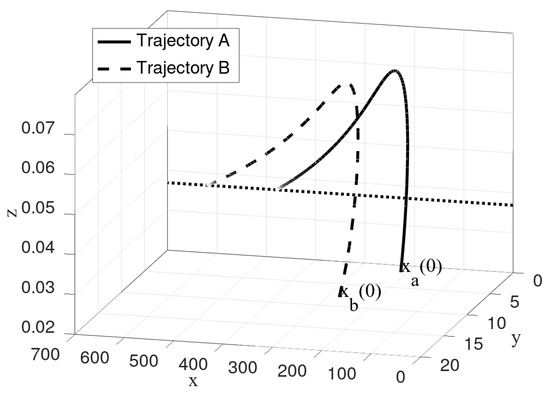 The phase space in Figure 5 illustrates that the equilibria of trajectories A and B, corresponding to the simulations in Figure 6 and Figure 7, respectively, converge to a straight line placed on the -plane for a given parameter value and initial conditions.
