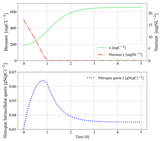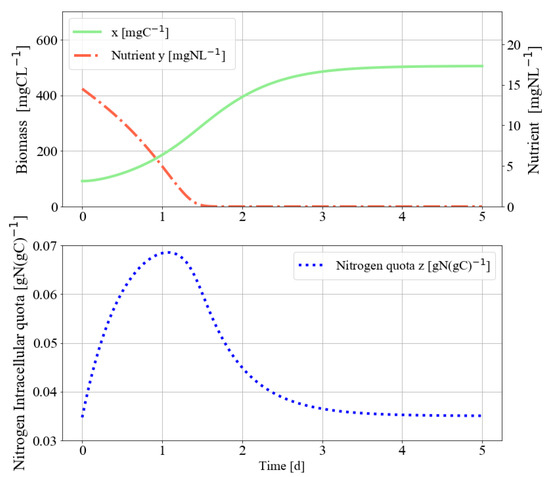 Batch mode simulation of biomass x, limiting nutrient y, and intracellular quota z concentrations vs. cultivation time under a constant light intensity of 150 , showing the final biomass production at nutrient depletion. The initial conditions correspond to , , and . The model input parameters for simulation are , , , and . Taken from [48].