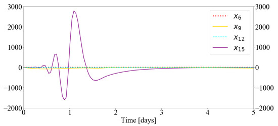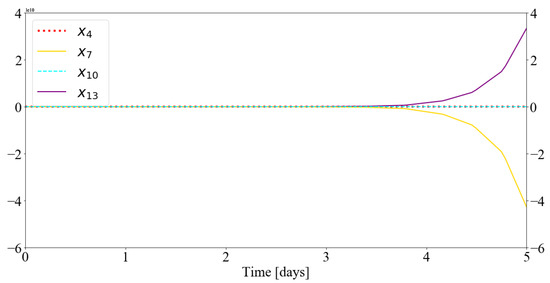 The solution of this equation was computed for the initial state , mgN, and as set in the simulation shown in Figure 6. The nominal parameter values , , , and used for the simulation were set based on the literature [48]. Figure 8 shows , , , and , which are the sensitivities of with respect to , , , and , respectively. Figure 9 shows the corresponding quantities of , , , and for ; Figure 10 shows , , , and for . An inspection of these figures shows that the solution is more sensitive to variations in the parameters and than to variations in the parameters and .