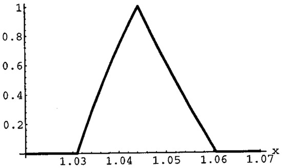 Given the membership functions for and , we get the membership function of the fuzzy number which, as shown in Figure 3, does not correspond to a triangular fuzzy number, because, as we see, this membership function is made up of nonlinear sections. Its expression is given by: