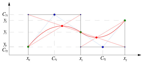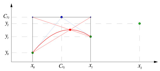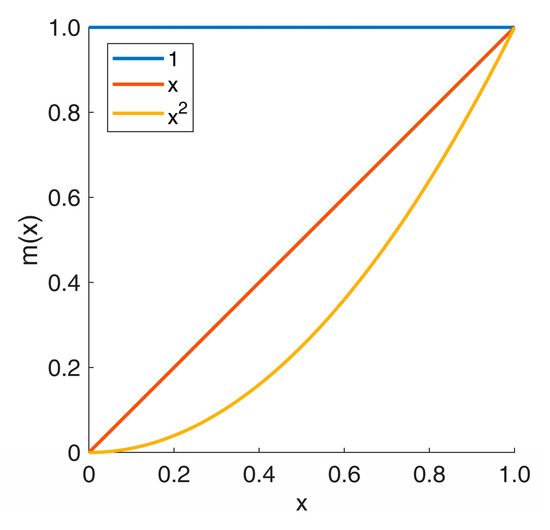 are the Bernstein basis polynomials; see e.g., the handbook by Bronshtein et al. [32] (p. 935). For a parabola, we obtain , and , cf. (41). These basis polynomials for a parabola are depicted in Figure 7.