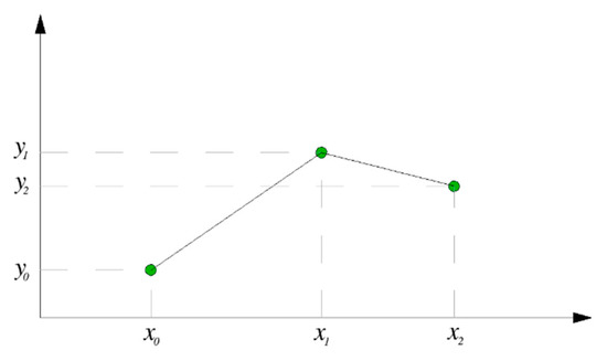 This form coincides with (19) and represents a second degree Lagrange interpolating polynomial through three points, see the handbook by Bronshtein et al. [32] (p. 918). The plot of the parabola is depicted in Figure 4.
