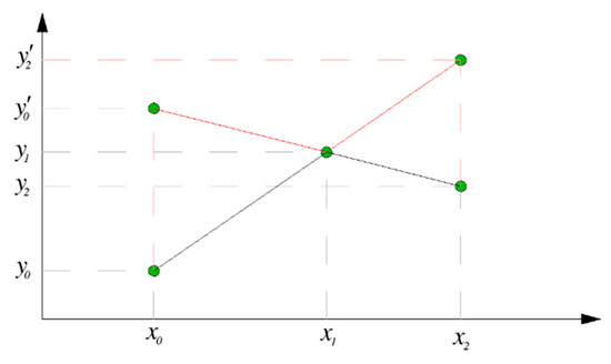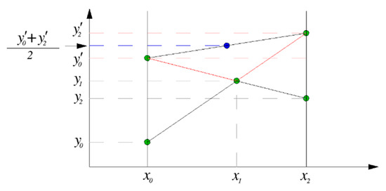 In this subsection, we present an alternative derivation of the polynomial in the Lagrange representation. We use the fact that each parabola can be represented as a combination of two lines. In fact, if we take a look at (5), we find that it can be rearranged into the form , which represents a combination (product) of two lines plus some constant value . By using this idea, the Lagrange representation of a quadratic polynomial can be derived, which results in a linear combination of three quadratic functions and the respective coordinates.