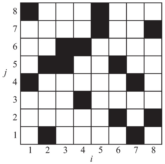 Each oscillator in the network was affected by two other oscillators; Figure 1. In particular, the first oscillator was affected by the fourth and eighth oscillators, and its model equation contained two nonzero coupling coefficients and . The presence of unidirectional couplings from the fourth oscillator to the first oscillator and from the eighth oscillator to the first one is illustrated in Figure 1 by the two black squares in the first row that correspond to the coupling coefficients and .