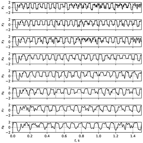 The time series of oscillators were divided into not overlapping fragments each containing points. In Figure 2, the first three fragments of time series are presented. The boundaries between the fragments are shown with bold gray vertical lines. The fragment length was chosen as a compromise between the desired time resolution and the number of points necessary for the estimation of model coefficients for the fixed l: coefficients , coefficients , and D coefficients for . We also took into account that each fragment had to contain at least 5–6 oscillations, otherwise the sorting map would not be efficient.