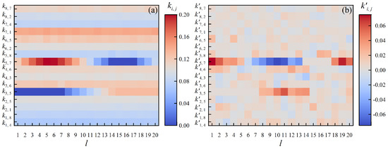 Figure 3a shows that 14 coupling coefficients were constant and two coefficients ( and ) noticeably changed their values during the observation time. In Figure 3b, the values of and exhibited the largest difference from zero over all . Note that Figure 3a,b agree very well between themselves. Figure 3 indicates that variation of couplings can be easily detected by inspecting the mean value and the slope of coupling coefficients (3). However, the slope was not very stable for the used length of fragments and errors were present at some l.