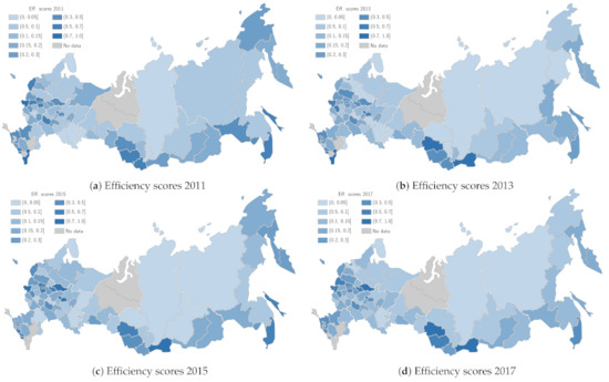 Russian regions have large variability in their area and population. The differences become more considerable after the territorial reform 2003–2008 which led to the merging of regions in East Russia. It must be recognized that the area of some regions in Russia exceeds many European countries. Therefore, the literature review is limited not only by studies of the regions, but also includes papers where the environmental efficiency of countries is evaluated. Jebali et al. [44] examine the energy efficiency determinants in the Mediterranean countries. A number of papers [41,52,59,62] evaluate the evolution of environmental performance in member countries of the European Union (EU). Grigoroudis and Petridis [51] present a study of environmental efficiency measurement that concerns 108 countries from all over the world.