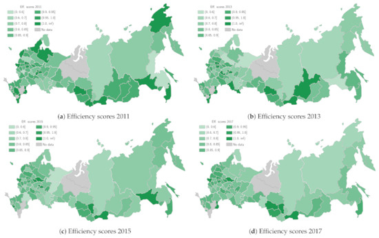 The data for the efficiency evaluation of regional environmental management systems were collected from the Russian Federal State Statistics Service’s regional statistical data [90,91]. The dataset includes all regions of Russia, with the exception of those in which the current costs of environmental protection measures are below the minimum of maintaining the operability of the regional environmental management system (10 million rubles were taken for the minimum threshold level). The efficiency scores of regional environmental management systems were calculated over the period from 2011 to 2017 in two-year steps, i.e., in 2011, 2013, 2015, and 2017 for three models: the regular CCR model with no weighting and scale shift restrictions (CCR), the CCR model with interval weighting and scale shift restrictions (CCR-AR), and the SBM model.