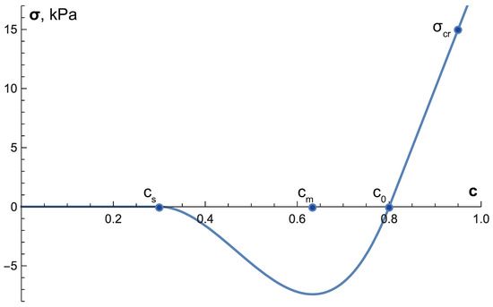 The function of the solid stress is based on the quite general assumption that the spatial variability at the microscale can be neglected and the volume fraction of cells can be chosen as a surrogate for the distance between them [9,20]. This function is illustrated in Figure 1. It is a smooth function, which corresponds to experimental observations at a qualitative level [31]. It assumes that at normal cell fraction, i.e., , cells interaction yields zero solid stress. If cells are pushed together, , the repulsive interaction appears, i.e., . With an increase in the distance between cells, at , the adhesive interaction manifests itself. At first it strengthens, and then gradually weakens due to the sequential ruptures of individual intercellular contacts. The stress eventually becomes zero at . For the sake of analytical simplicity, the part of the function that corresponds to the repulsive interaction, is taken to be linear. In order for the critical fraction of cells, at which cell proliferation ceases, to be less than one, the condition must be met.