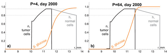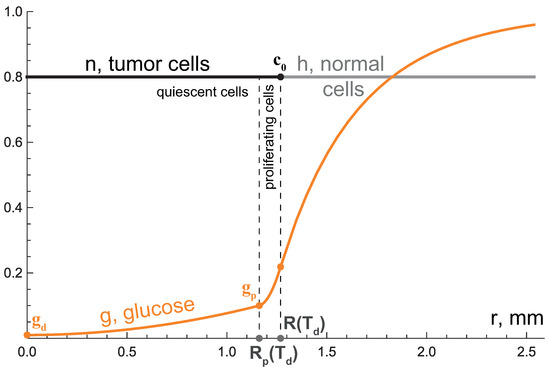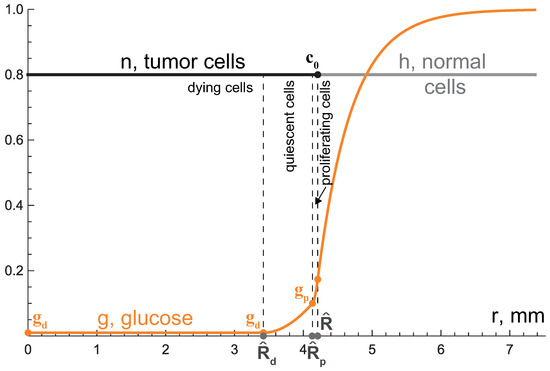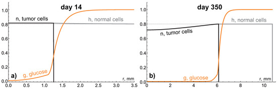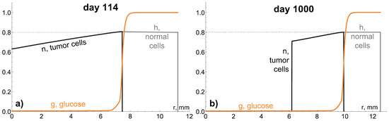 As it follows from Equation (9), the death of tumor cells contributes to the decelaration of tumor front propagation, and the larger the total volume of dying cells, the greater this contribution. At the last stage, the tumor growth tends to a complete stop, and the distributions of model variables tend to stable profiles, depicted in Figure 4, where , , . Note that the glucose level is uniform within the core of dying cells.